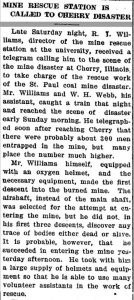 Part of the early rescue work was carried out by staff of the University of Illinois Mine Rescue Station. As the Daily Illini reported, on Saturday night, rescue station director R. I. Williams and his assistant W. H. Webb were contacted by telegram and they boarded the next train. By Sunday morning, they were on the scene with extra oxygen helmets to distribute to volunteers on site. By Wednesday morning, newspaper editorial staff described the scene and its impact on campus communities. On December 1, a longer account of the heroic work of Mr. Williams and Mr. Webb were recounted for readers. In January, a substantial Congressional appropriation to mine rescue units like the one at Illinois was funded.