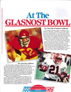In 1989, Illinois football almost made history by competing in the Glasnost Bowl. The Glasnost Bowl, which was planned to be an annual event, would have written Illinois and the University of Southern California (USC) into history as participants in the first football game played in the Soviet Union. The game was initially scheduled for September 2, 1989, in Moscow’s Dynamo Stadium. Illinois head coach John Mackovic stated, “We are proud to participate in a special first event for college football and the history of intercollegiate sport in this country. As a participant in the Glasnost Bowl, we hope that Illinois can be an example of what the finest in college athletics is about [12].” Despite great enthusiasm from both teams at the prospect, the game was officially canceled by Raycom Sports Entertainment on June 7, 1989. Raycom stated the reason for the cancellation was contract issues with Soviet sports authorities. The Glasnost Bowl was downgraded to a regular season game. This flyer for the Glasnost Bowl depicts what could have been [13].