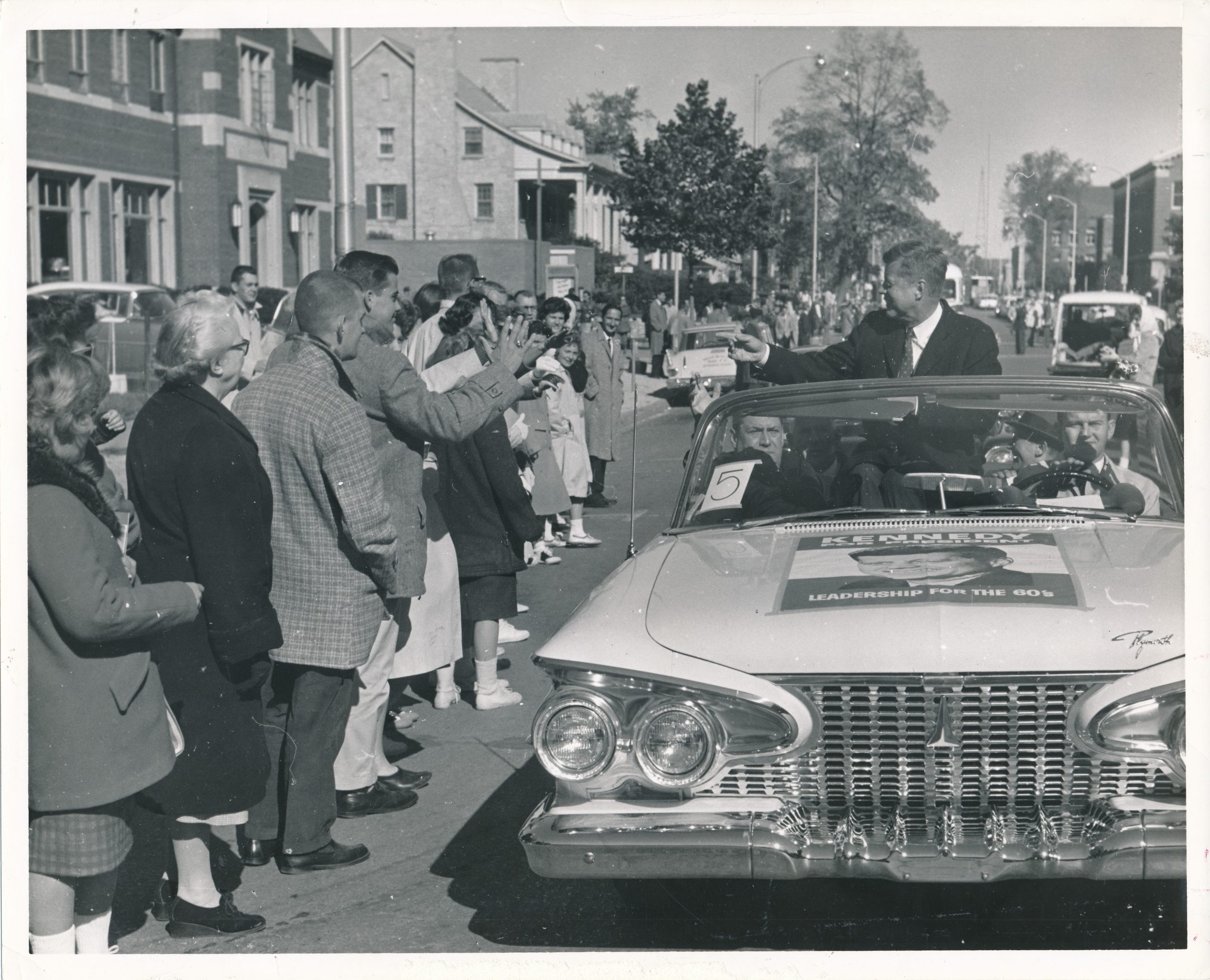 Befitting Illinois’ status as a swing state, the Democratic candidate campaigned here in the final days before the election. Originally, he was supposed to speak in downtown Champaign, which was changed to an airport rally, and finally became a speech on the Quad.[3] On October 24th, Kennedy and his entourage were greeted by a crowd of 500 at Willard Airport.[4] After traveling to campus, he addressed a crowd of more than “10,000 frenzied Illini,” speaking on foreign policy as students grappled to get a better view. Some resorted to climbing trees, roofs, and gathering around windows in nearby Lincoln Hall.[5][6]