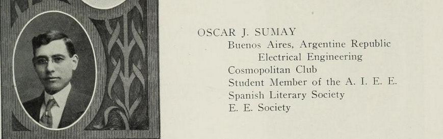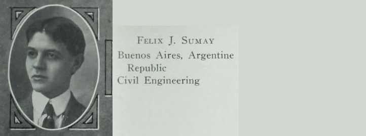 Mr. Oscar Jose Sumay, (B.S. Electrical Engineering, 1909), of Chascomús, was an engineer and a student leader. [9] He was a founding member of the Centro Literario Espanol and its first vice president too. At one club event, Mr. Sumay and other students debated the influence of the U.S. Monroe Doctrine in Latin America (December 1907), he became club sergeant-at-arms during his junior year (1908), and he became club president during his senior year (1909). After graduation, Mr. Sumay returned to Argentina to work for the Argentine Railway Company. In 1911, Mr. Sumay returned for his younger brother Felix’s graduation and he married Iva M. Miller, of Champaign, and they returned to Argentina together where they raised a family.
