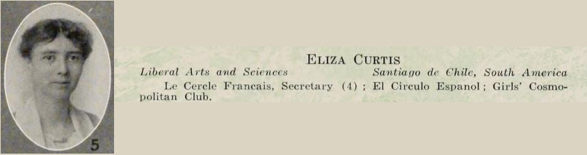 During the Fall 1917 term, Ms. Eliza Curtis, (B.A. 1919), of Santiago, arrived on campus and was a member of Spanish Club by October. Supported by the Chilean government for four years, Ms. Curtis studied high school organization and foreign language teaching. As it happens, Ms. Curtis later became an instructor in romance languages, and she remained in town for a few years. By 1920, Ms. Curtis was a member of the University of Illinois Women’s Club. But by 1921, Ms. Curtis had already taken a position at Grinnell College in Iowa.