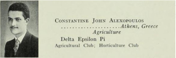 Mr. Constantine John Alexopoulos, (B.S. Agriculture, 1928-29; M.S. Horticulture 1928; PhD Botany 1932) became a distinguished mycologist. [7] Born in Chicago to Greek parents, Dr. Alexopoulos attended elementary school in Greece but high school in Chicago. He earned all three of his college degrees at the University of Illinois and he remained as an instructor for a few years too. Later, Dr. Alexopoulos became a tenured professor at the University of Texas at Austin.