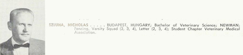 Mr. Nicholas Szluha, (B.V.M., 1962), of Boroch, was both a veterinarian and an outstanding fencer too. In January 1960, Mr. Szluha quickly established his skill at the saber scoring a perfect 3-0, in an Illinois competition against the Air Force Academy. Summarizing the performance, the DI writer wrote that “Szluha, a 26-year-old sophomore from Budpest, Hungary, left no doubt in anyone’s mind that he is going to be a sensation in the sabre“. Mr. Szluha had been fencing in Hungary for years, before coming to Illinois. A leg injury prevented Mr. Szluha from participating in the 1960 NCAA Fencing Championships. The following year, in an interview with the DI, Mr. Szluha described his life in Hungary, and his plans to become a U.S. citizen, and to fence against Hungary in the upcoming 1964 Olympics. Mr. Szluha’s profile photos were often featured in DI issues at this time too. More of Mr. Szluha’s extraordinary fencing career should be followed in detail in the pages of the Daily Illini. After graduation, Dr. Szluha would practice veterinary medicine in Oxford, Michigan for over fifty years. [4]