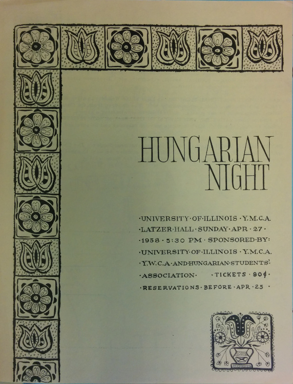 In 1922, Y.M.C.A. Secretary Donald Alexander Lowrie (Record Series 15/35/53) had visited Hungary, during his work for the International Y.M.C.A. In November 1956, the Illinois Student Senate endorsed student participation in a nationwide student petititon to Prime Minister Nehru of India to intervene and mediate on behalf of Hungarian student protesters in the 1956 Hungarian student protests. The following day, a Daily Illini wrote in support too, while the Y.M.C.A.-Y.W.C.A. Little United Nations student group discussed the issue too. In February 1957, the Hungarian Freedom Tour, the Hungarian fencing and gymnastics troupe led by Hungarian Olympic fencer György Piller, visited town during a national tour (and the 900-attendee event received a great review from the Daily Illini too.) From at least 1963 through 1980, Recreation and Leisure Studies Professor Allen V. H. Sapora (Record Series 16/5/22) researched outdoor recreation in locations including Debrecen, Kecskemet, and Szombathely. In 1966, the Hungarian National Ballet came to campus. From at least 1967 through 1997, Music Professor Alexander L. Ringer (Record Series 12/5/43) promoted the Kodály method in music education as well as founding the International Kodály Society too. 1968 Hungary is documented in at least once scrapbook in the Geology Department Scrapbooks (Record Series 15/11/11). From 1972 through 1980, Cello and Chamber Music Professor Gabriel Magyar (Record Series 12/5/23) taught at Illinois, following a sixteen-year career with the Hungarian String Quartet.
