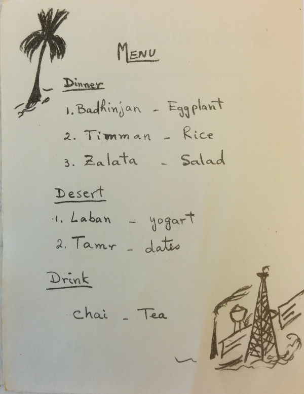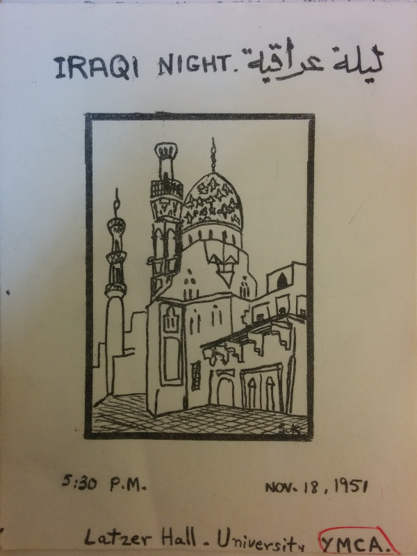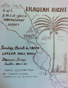 At least as early as 1951, the first Iraqi Night program was organized by Iraqi Illini with the administrative support by the Y.M.C.A. The 1951 Iraqi Night included food, live music, poetry readings in English translation, and a narrated slideshow of pictures describing Iraq.