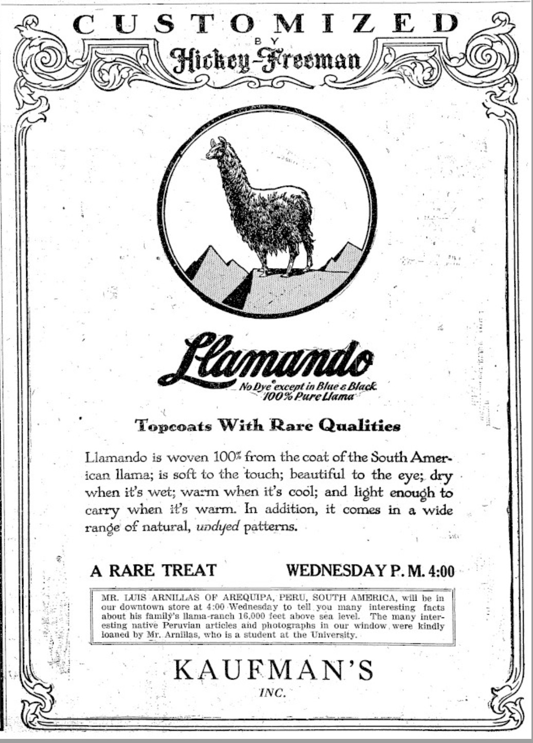 Mr. Luis Ernesto Arnillas, (B.S. 1929), of Arequipa. In 1929, he gave a local talk about his family’s llama farm, and he even lent personal photographs of Peru for display at the local business Kaufmans. In the summer of 1929, Mr. Arnillas enrolled in the University’s summer coaching school.