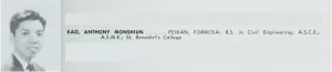 There was also Mr. Anthony Monshiun Kao, (B.S. Civil Engineering, 1959), of Peikan, and Mr. Stephen Sui-kuan Wang, (B.S. Electrical Engineering, 1959), of Tainan, who also might not have left many records behind.