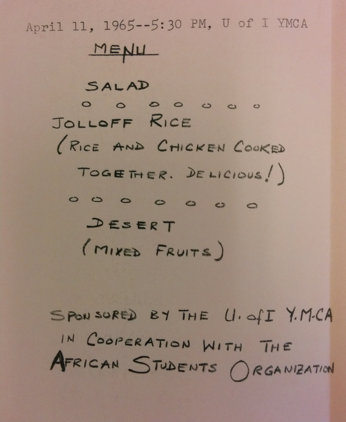 At least as early as the 1960s, Ugandan students have been enrolling at the University of Illinois. In April of 1964, at a campus conference on Africa, which was jointly organized by the African Students Organization and the Association of International Students, Zabaloni Kabaza lead an analytical discussion on East African politics. In April of 1965, the African Students Organization and the off-campus University YMCA organized the African International Supper event, with the theme “Africa in Transition”. The event included many students from different African countries including Ugandan Illini Gael Kiwuwa. While in 1969, tragically, engineering student Paul M. Lukindu, of Masaka, was fatally wounded while driving his car off-campus.