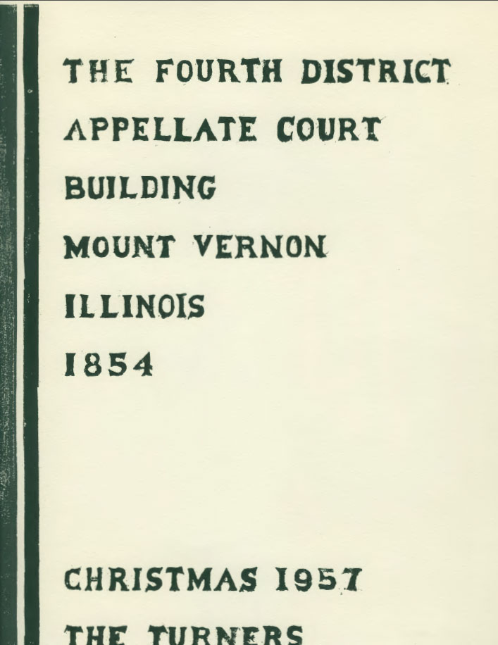 Cut from some “fairly new tulip wood” picked up in Edgar County, the 1957 woodblock featured the Fourth District Appellate Courthouse located in the center of Mt. Vernon, IL.