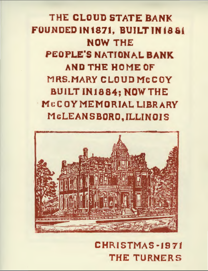 The Cloud State Bank, also known as the People’s National Bank, is located in McLeansboro, Illinois. The building was designated and built from 1880-1882 by Aaron G. Cloud and his son Chalon Cloud. It was placed on the National Register of Historic Places in 1978. Frederick Koeper describes the building in Illinois Architecture From Territorial Times to the Present, noting, “Early descriptions of the bank building stress its ‘elegance’. Built of hand-made red brick and fine white limestone, it was finished in walnut, cherry, and wrought iron. The security measures were incomparable and the safe and vault the largest and strongest in Southern Illinois. The clock in the tower, made in Boston, was installed in 1886, and its 800 pound bell could be heard for miles.” The Turners’ full research on the Bank is accessible in their Christmas 1971 note, which was enclosed inside the card.