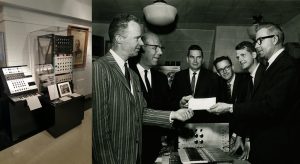 The Sousa Archives’ newest exhibition, “Early Sound Synthesis at the University of Illinois: James Beauchamp and the Harmonic Tone Generator,” opened today. In 1958, Lejaren Hiller Jr. founded the Experimental Music Studio (EMS) at the University of Illinois with the intention of creating and developing electronic and computer music. Due to the EMS’ interdisciplinary nature, the studio attracted the attention of James Beauchamp in 1961, one of the most important contributors to the development of electronic music at the University of Illinois. After receiving a Master’s degree in electrical engineering at the University of Michigan in 1961 and working for a year in Los Angles at a space technology company, Beauchamp came to the University of Illinois in 1962 as a PhD student in electrical engineering, assuming a fellowship under a 3-year grant from the Magnavox Corporation for his early work in the EMS. In 1964, under the direction of Hiller, Beauchamp completed the Harmonic Tone Generator (HTG). The HTG was one of the first voltage-controlled electronic music synthesizers developed in America. The original HTG was donated to the Sousa Archives in January 2015, but it could not be restored to playing condition. To provide visitors with a better idea of how the HTG functioned, Mark Wayne Smart of the University’s Department of Electrical & Computer Engineering agreed to work with Beauchamp to construct a recreation of his original HTG. Through the financial support of the Sousa Archives and Center for American Music the newly created HTG-2 provides the same functionality that Beauchamp had built into his original synthesizer and visitors are encouraged to play the HTG-2 to begin their exploration of the early electronic sound synthesis techniques that were developed at the University of Illinois.