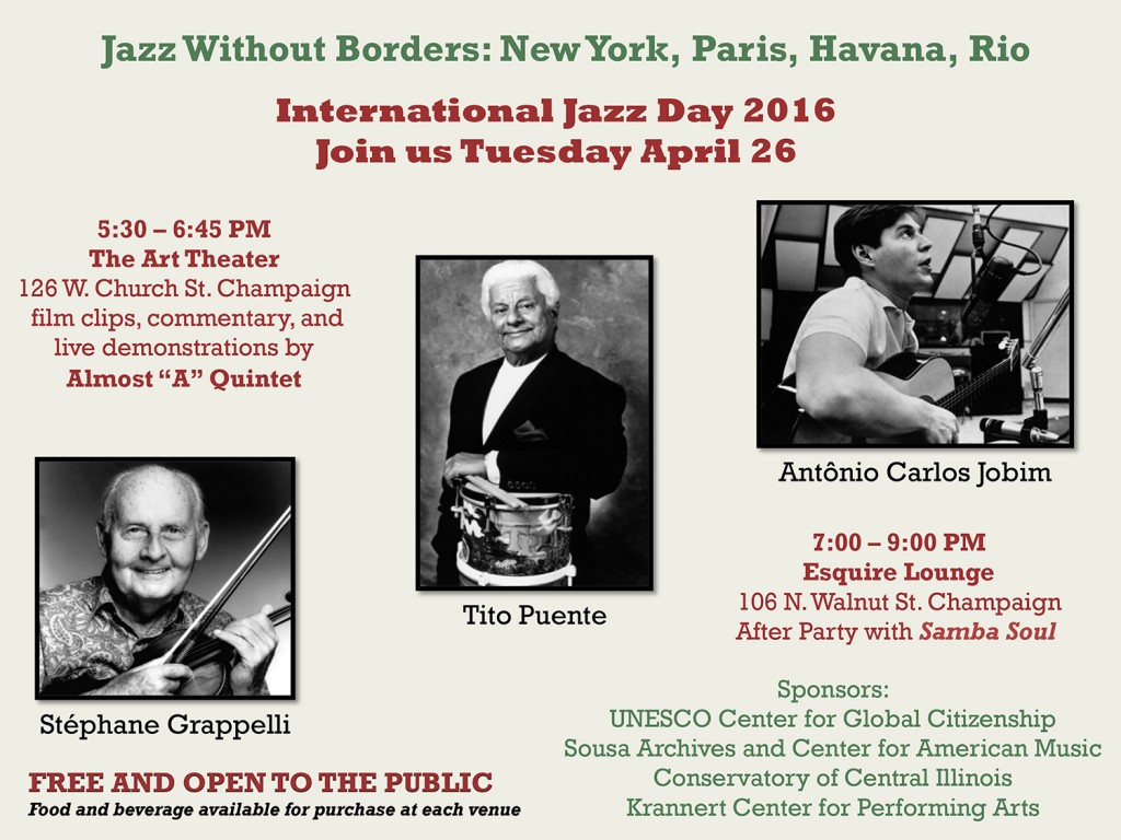 The Sousa Archives and Center for American Music in collaboration with the UNESCO Center for Global Citizenship, The Conservatory of Central Illinois, and the Krannert Center for the Performing Arts is sponsoring our third International Jazz Day celebration on April 26, 2016. From 5:30-6:45pm the Jazz without Borders: New York, Paris, Havana, Rio program will offer film clips and commentary, accompanied by live musical demonstrations of both gypsy and Latin jazz techniques at Champaign, Illinois’ Art Theater, followed by an after-party performance by Samba Soul at the Esquire Lounge.