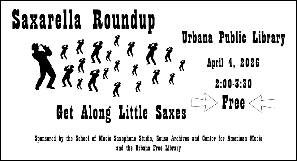 For those folks, both young and old, who might have a hankering for pre-jazz era saxophone music, then we have an exciting performance by the talented students from the University of Illinois sax studio that will take place at the Urbana Free Library. This not-your-mama’s tea-party concert highlights the rhythms and sounds of today’s up-and-coming saxophonists combined with the musical styles of early vaudeville artists like Rudy Wiedoeft, Wilbur C. Sweatman, Wheeler Wadsworth, the Brown Brothers, and the Five Spillers. It’s music to get your toes tapping and feet dancing as you join us with our Saxarella roundup. After the concert, check out the Sousa Archives and the KCPA Global Arts Performance Initiative’s International Jazz Day Film Screening, “The Best of the Best: Jazz from Detroit” at the Spurlock Museum. For further information about either event, call 217-333-4577 or email schwrtzs@illinois.edu.