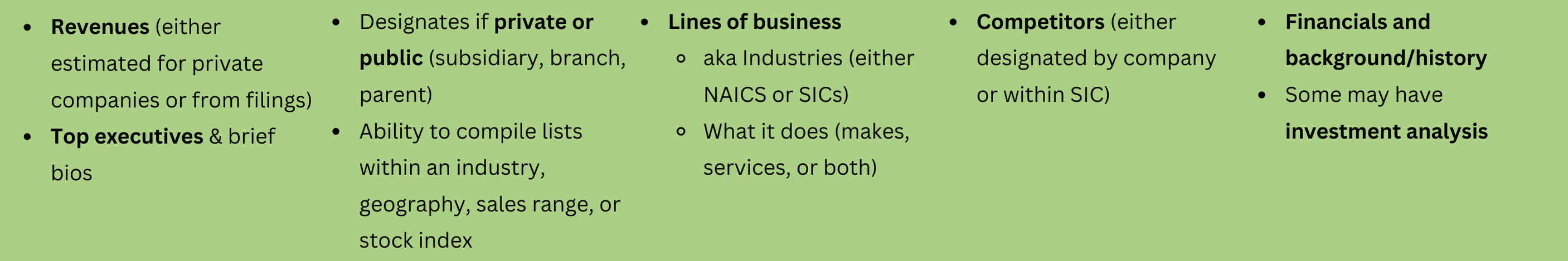 | Data Axle (US companies only) International Directory of Company Histories ProQuest Historical Annual Reports | Nexis Uni EDGAR | Emerging Markets Information Service | Business Easy Search ProQuest One Business Business Source Ultimate |