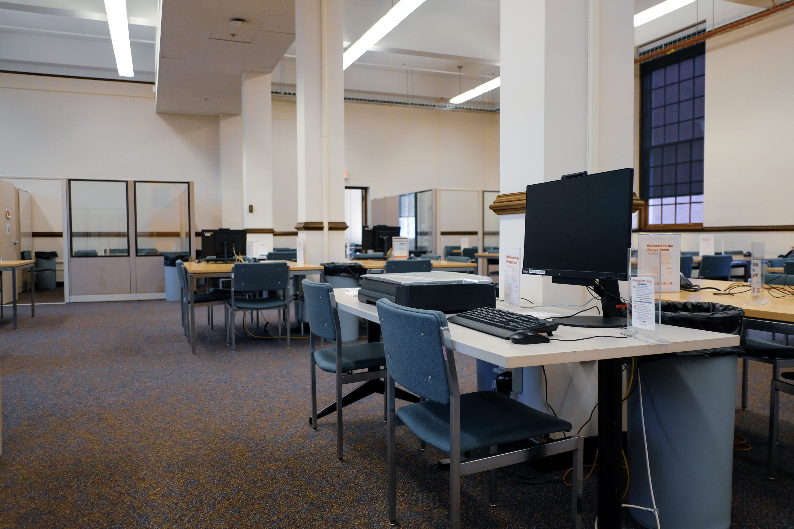 Lots of natural light, high ceilings with overhead florescent lights. No completely enclosed spaces that can be made dark so probably not the best for anyone with light sensitivity.