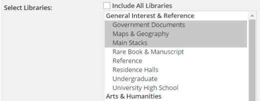 - Select Libraries: This option determines which libraries the new titles will be pulled from. Either select the checkbox labelled “Include All Libraries” or select one or more consecutive libraries from the list below.