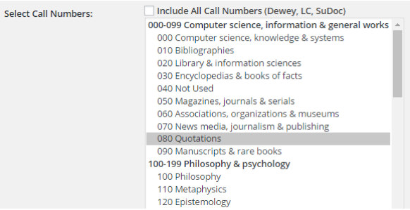 - Select Call Numbers: This option determines what call number range of the New Titles selection. Either select from the checkbox labelled “Include All Call Numbers (Dewey, LC, SuDoc)” or select one or more consecutive call number ranges from the list below: