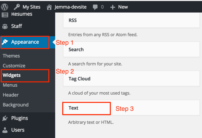 - Choose “Appearance”, “Widgets” and “Text”.