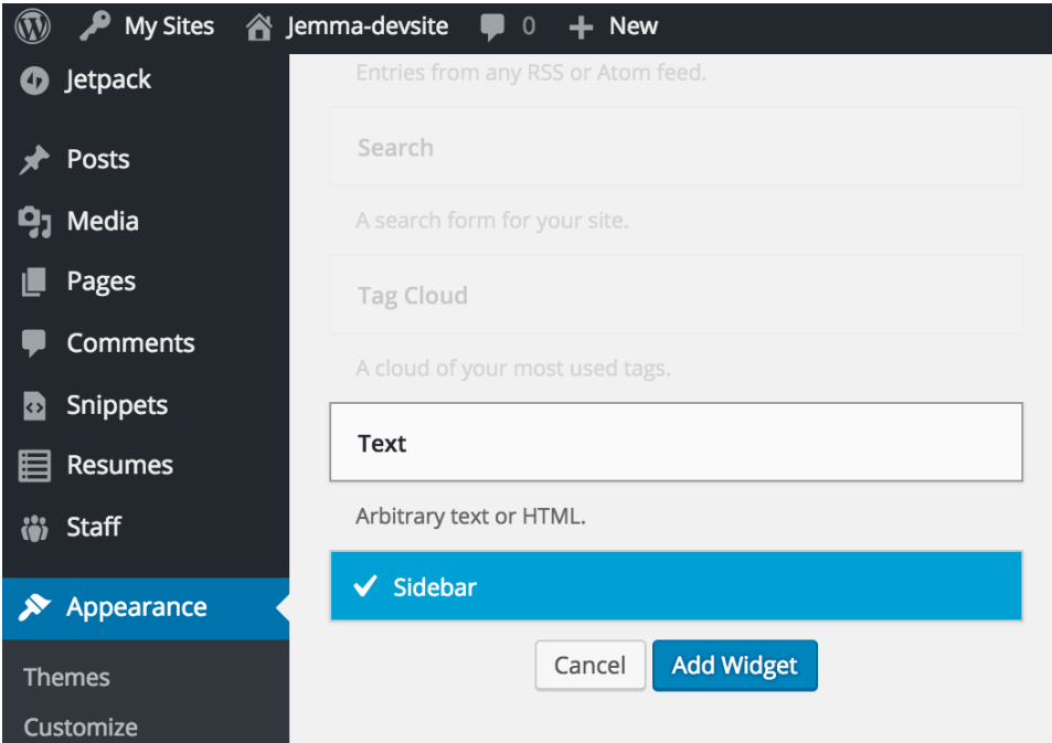 - Once you select “Text”, the rest of Widget areas will be grayed out. Click “Add Widget”.